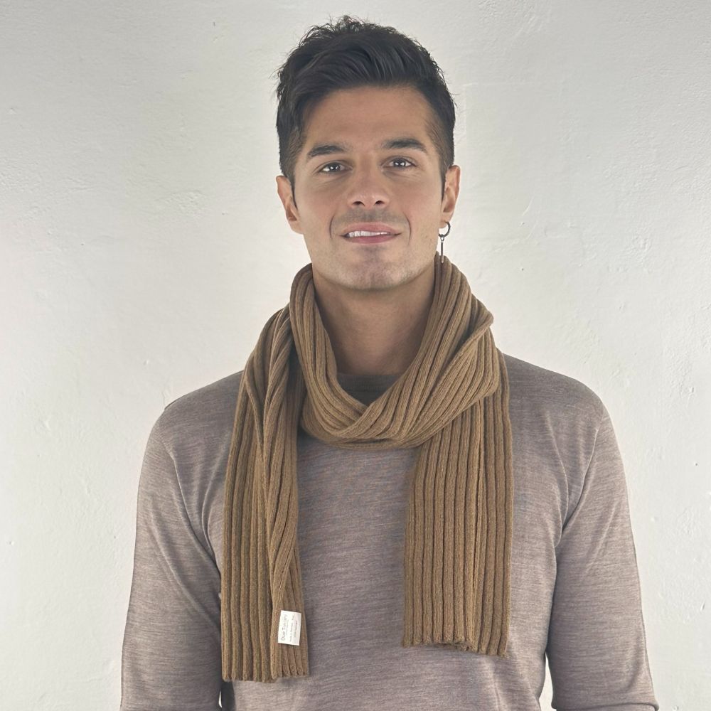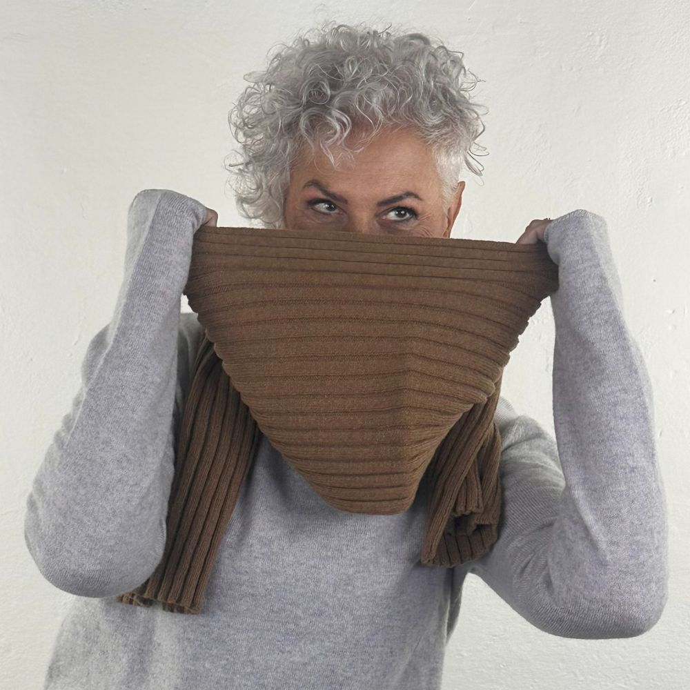 The Due Toscani ribbed scarf is made of 100% recycled cashmere, regenerated in the Prato textile district and transformed into a timeless accessory, combining luxury and sustainability.